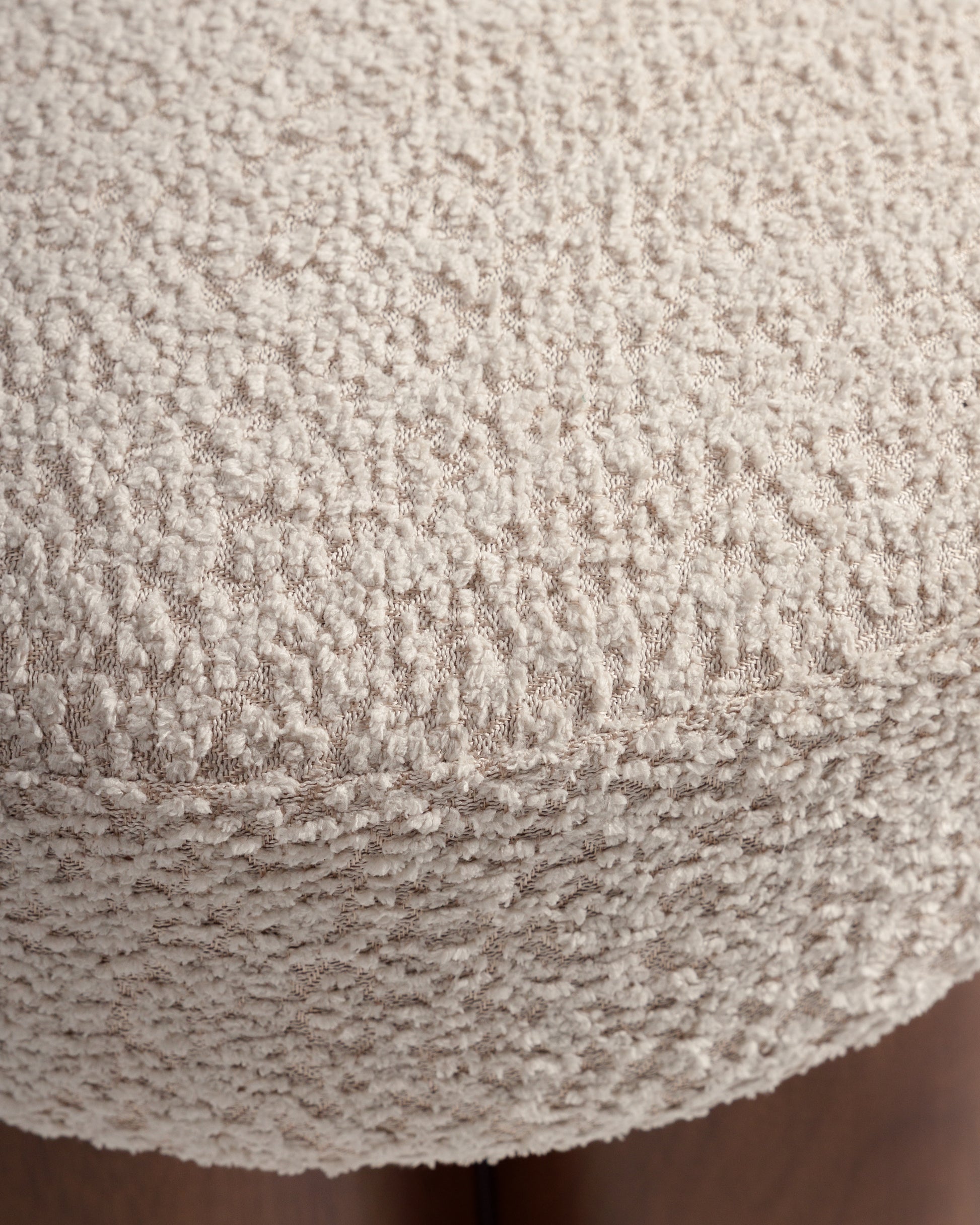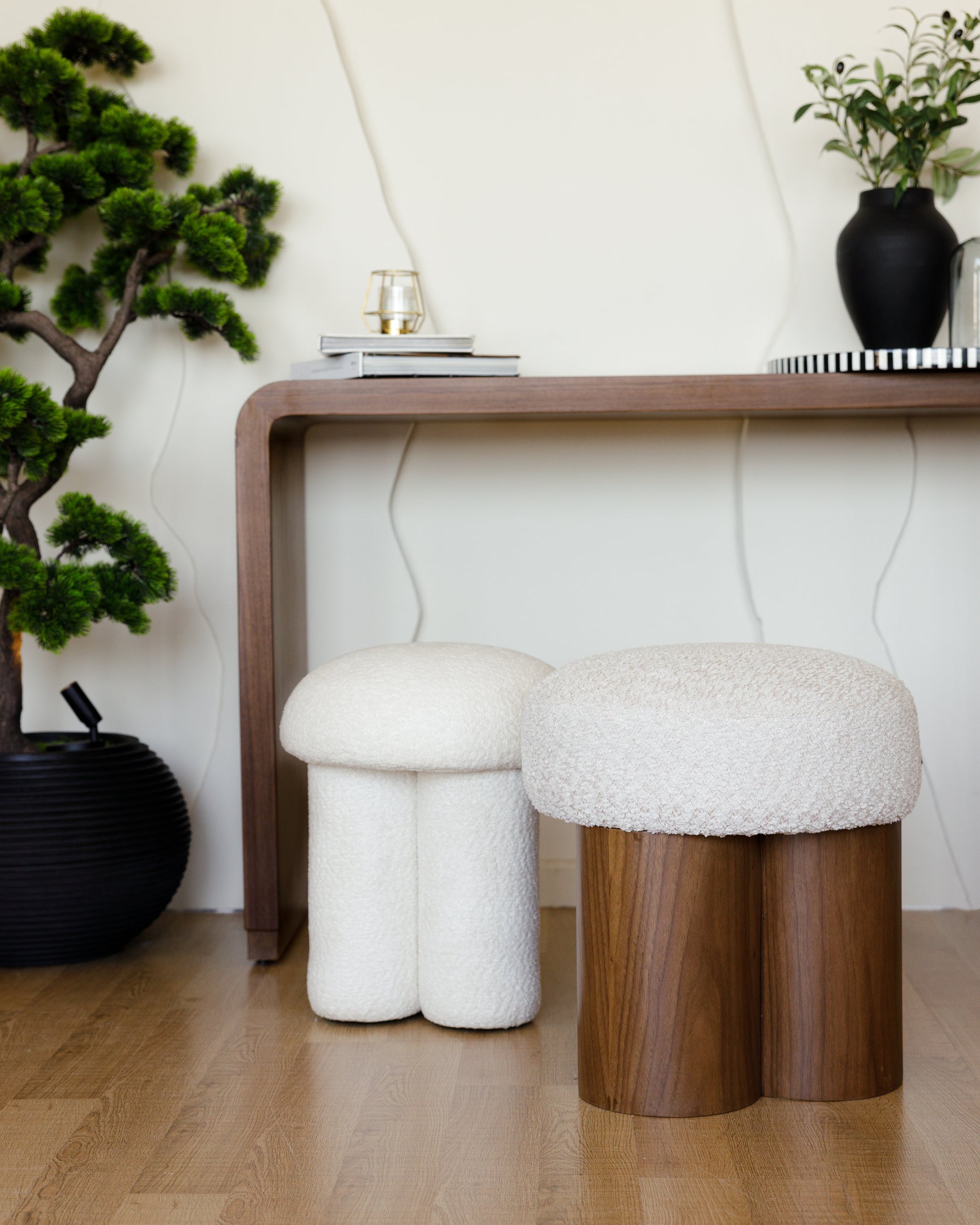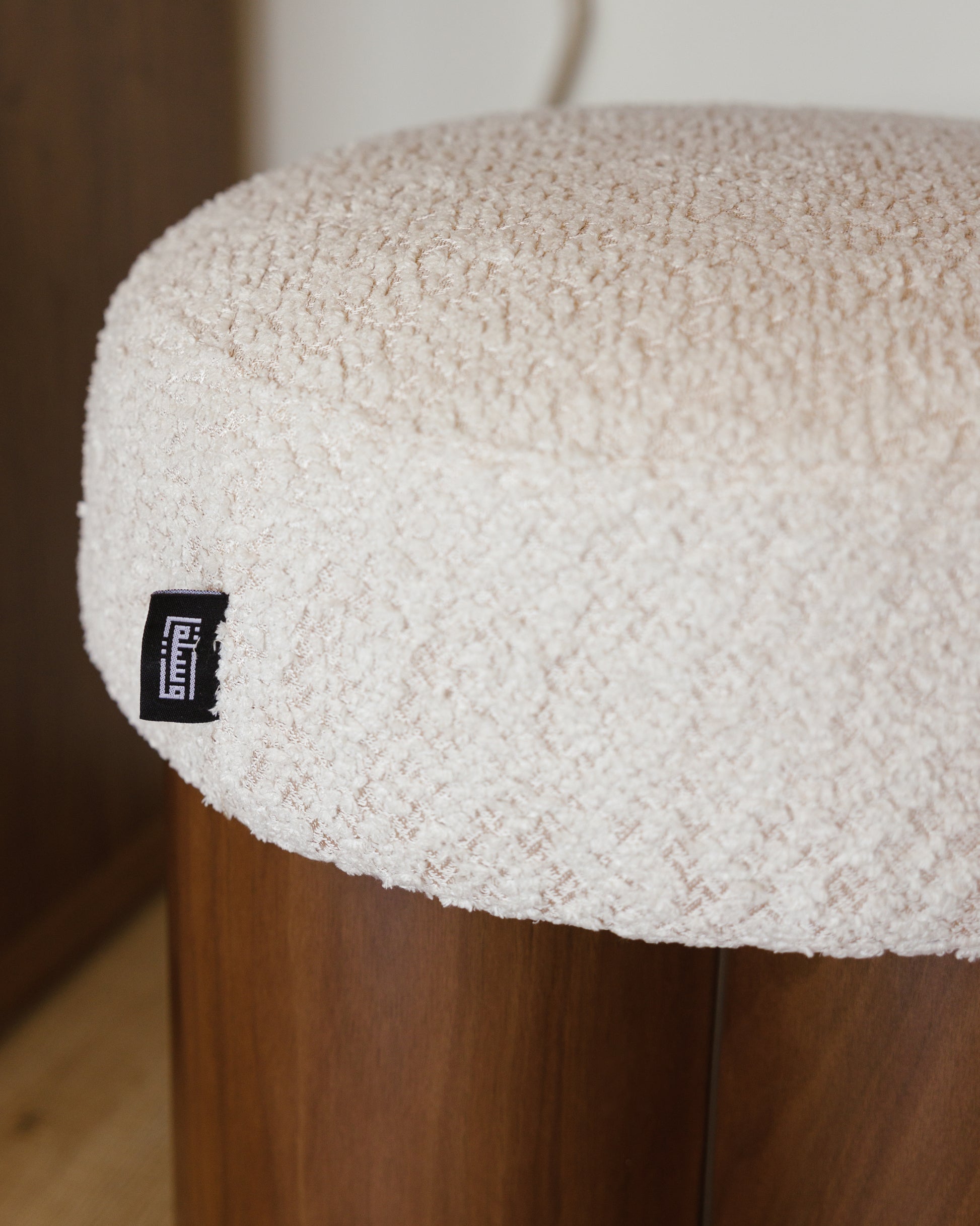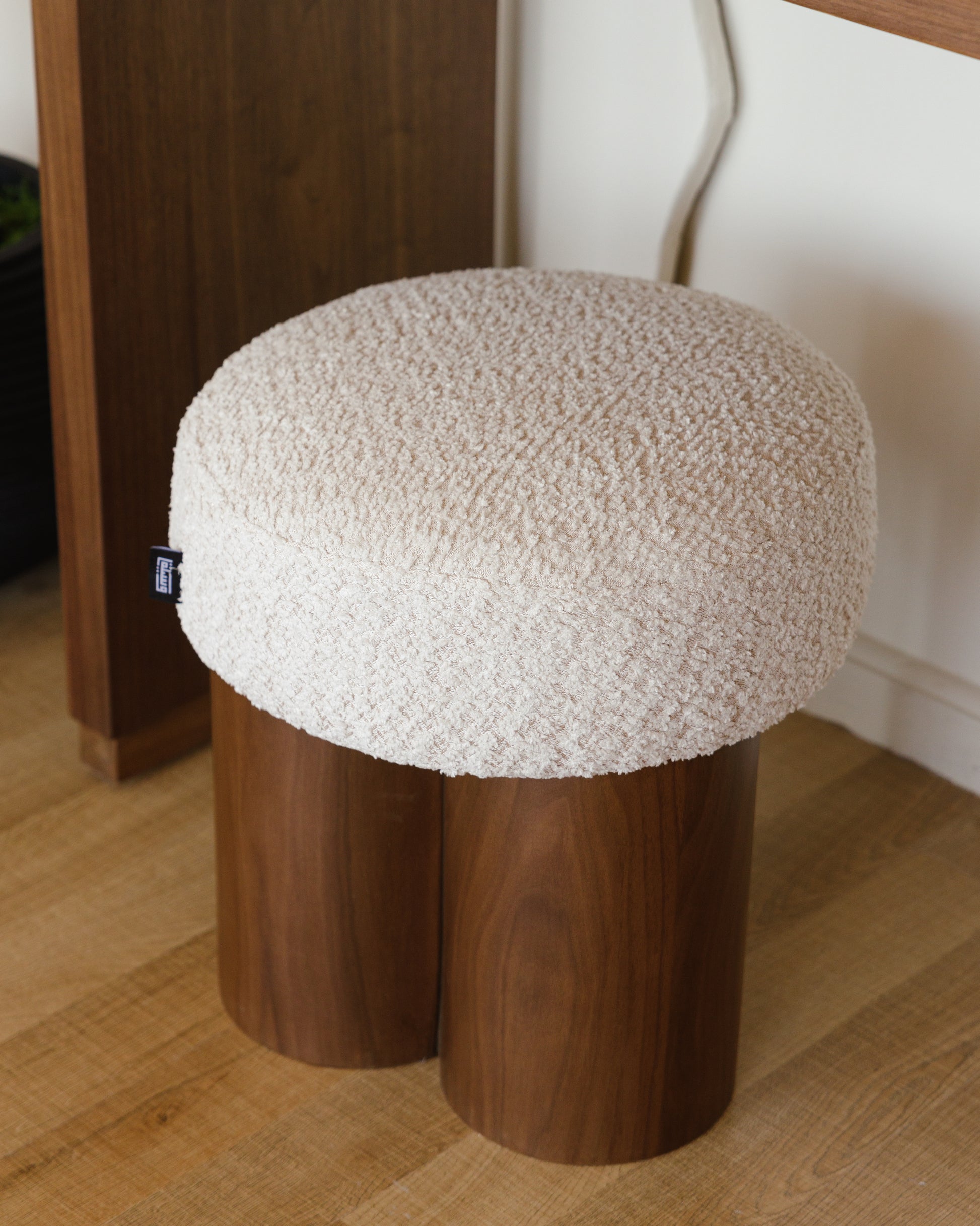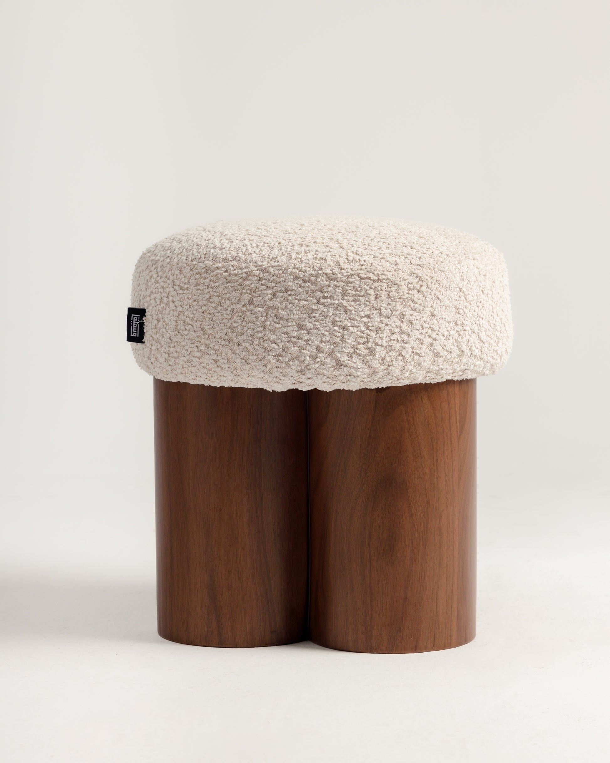 يتميز هذا البوف بتصميم فريد، فهو مصنوع من قاعدة ثلاثية الأسطوانات من خشب الجوز، ومغطى بوسادة كريمية ناعمة، مما يمنحه مظهراً جذاباً وراحة فائقة. سواء استُخدم كمقعد أو مسند للقدمين أو قطعة ديكور مميزة، فإنه يندمج بسلاسة مع الديكورات الداخلية البسيطة، والبوهيمية، والمعاصرة.
